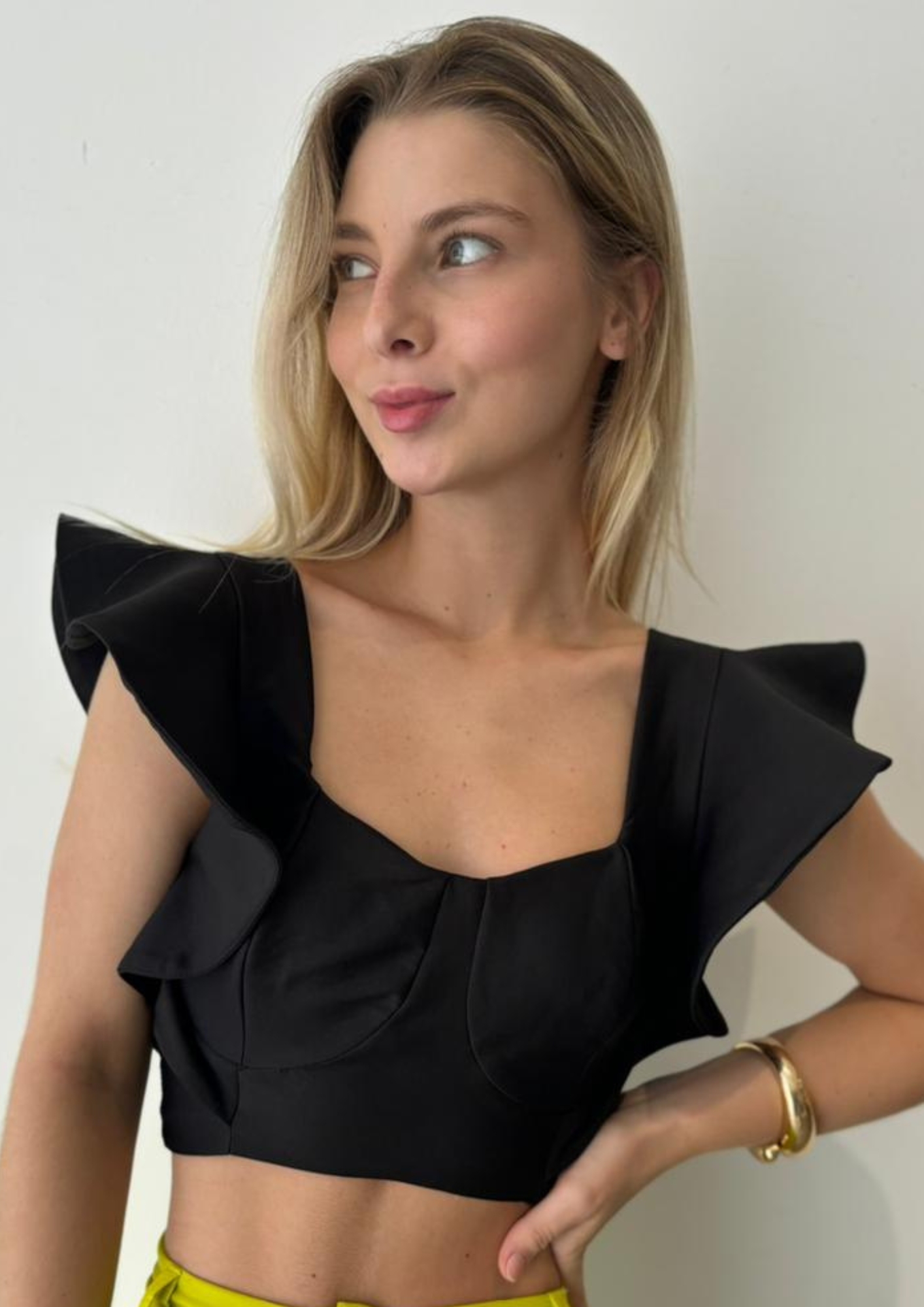 Cropped com babados no ombro, alta costura na vertical na parte dos seios, com abertura de zíper nas costas, estilo corselet, curto.