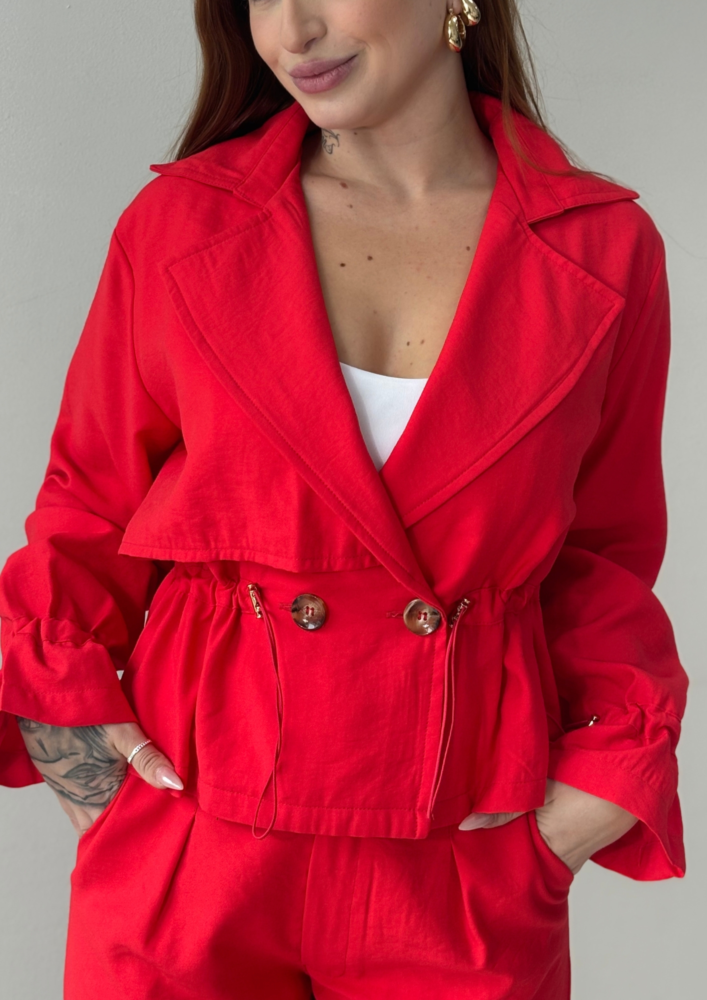 Jaqueta curta com elástico na cintura e nos pulsos também, veste super bem, alfaiataria leve e macia. Faz conjunto com nosa calça cenoura Sara, em cores de vermelho e bege.