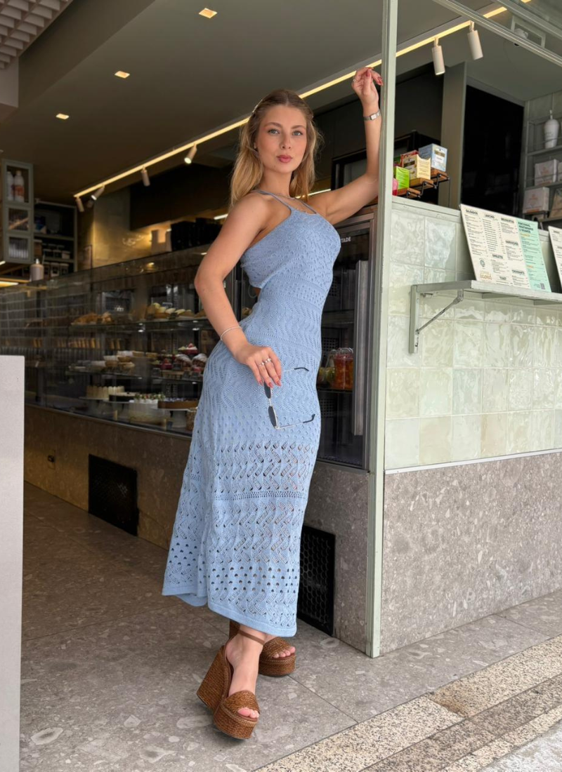 Vestido longo em tricô com amarrações nas costas, com forro em sua composição, tecido de alta tecnologia que estica sem gerar transparência, veste super bem, fica bem justinho no corpo, alça regata bem fininha, SEM fenda lateral. Seu comprimento é maravilhoso, caimento reto e delicado, o tricô é um tecido que tem que ter cuidado ao lavar e não colocar na secadora para não estragar a sua trama.